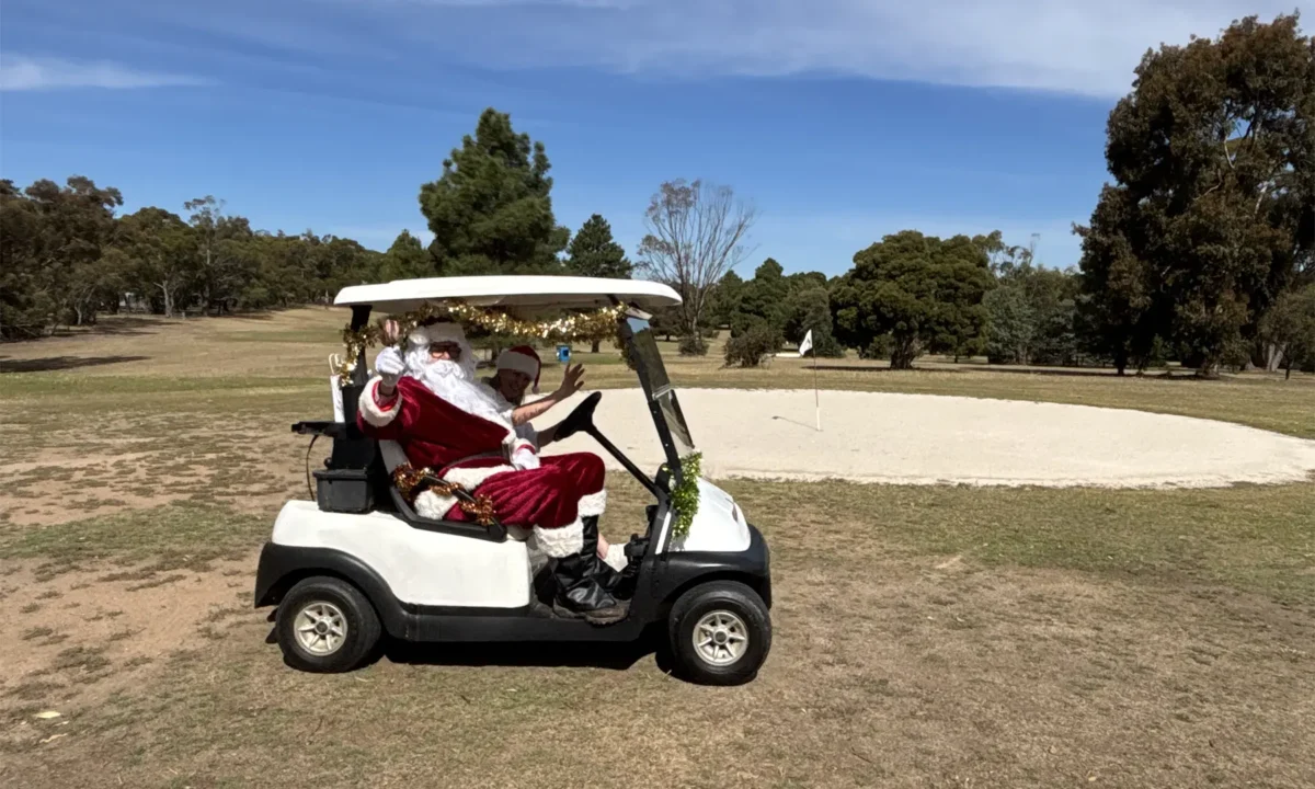 Santa arrived in Maldon on a golf buggy! The Golf Club’s Community Christmas Party was a lovely and low-key affair, with warm Sunday sunshine and mellow music setting the tone. Most people just hung out under umbrellas with a bevvy, with chips, wraps and sausages available to purchase from a food van, taking the pressure…